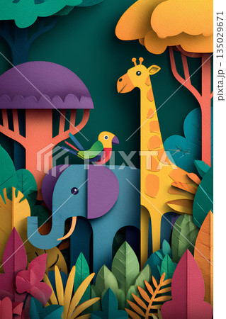 ジャングルの象とキリンとオウムの切り絵風ペーパーアート(縦)