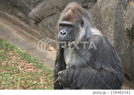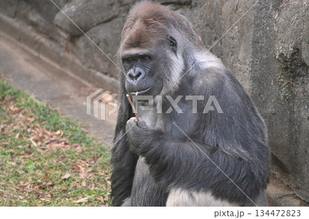 手持無沙汰なゴリラは気休めに木の枝をくわえる