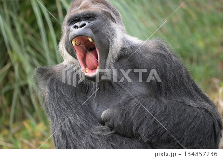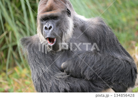 この葉は大好きなんだようと興奮して口が開いたままのゴリラ