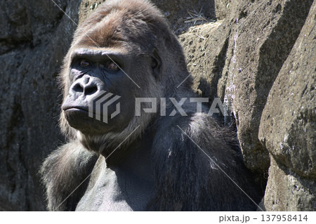 岩にもたれて寛ぐゴリラのポートレート