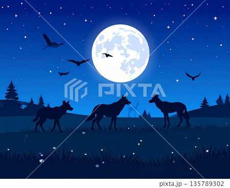 サンタを待つトナカイ/静かな雪の森と満月の夜