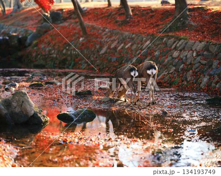 奈良の東大寺の鹿 紅葉