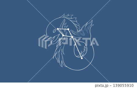 ネイビー色の背景に浮かぶいるか座の線画イラスト(白線でイルカの絵と星座線)