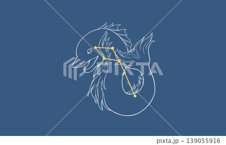 ネイビー色の背景に浮かぶいるか座の線画イラスト(白線のイルカの絵とゴールド色の星座線)