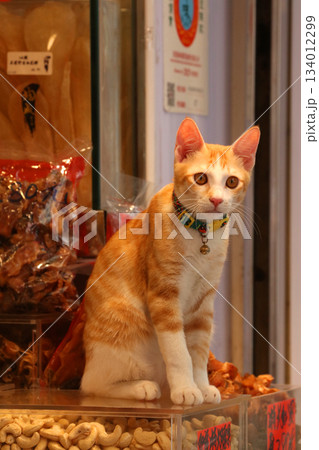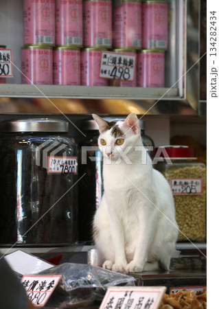 香港・徳輔道西の乾物店で売られる超高級食材の上で店番するネコ