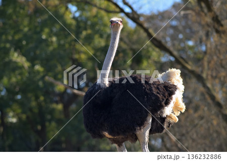太陽の光を受けて羽毛の輝くダチョウ