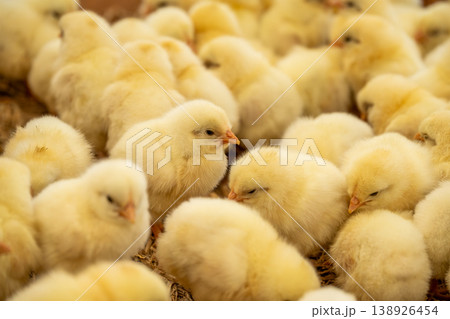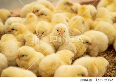 密集して身を寄せ合う可愛いヒヨコたち 養鶏場の雛鳥