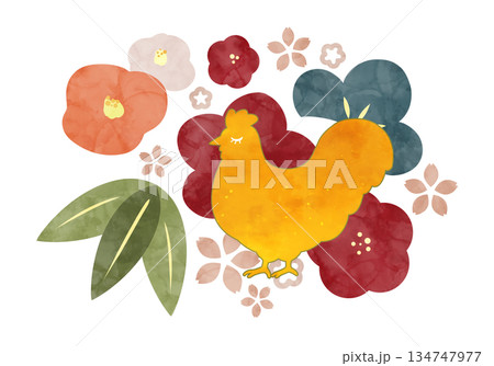 和柄と金のアウトラインで描かれた水彩の酉(にわとり)のイラスト