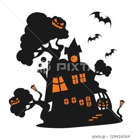 ハロウィンのカボチャオバケが棲む家のシルエットイラスト