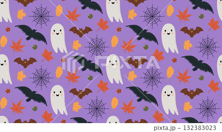 A cute, seamless vector Halloween pattern. Features smiling ghosts, bats, crows, spider webs, and autumn leaves on purple.