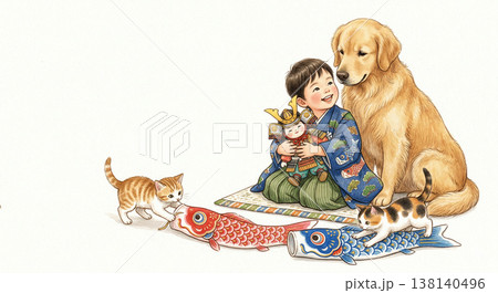 端午の節句を祝う男の子とゴールデンレトリバーと子猫のイラスト