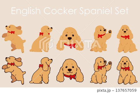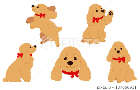 シンプルで可愛いイングリッシュコッカースパニエルのイラストセット(赤いリボン) 主線なし