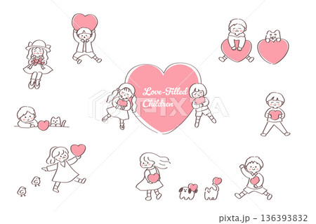 ピンクのハートと子供や動物の可愛い手書きイラストセット|優しさと幸せを表現