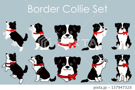 シンプルで可愛いボーダーコリーのイラストセット(赤いリボン)