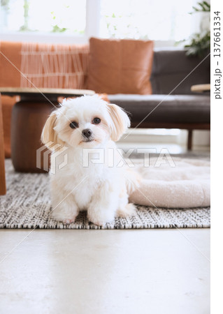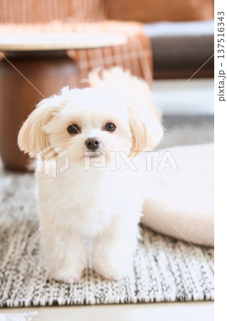 リビングで過ごすマルチーズの全身 犬のいる暮らし
