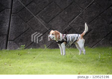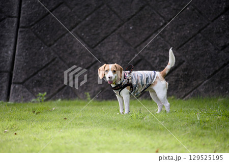 見上げる犬 ビーグル 芝生の庭 芝生 蔦