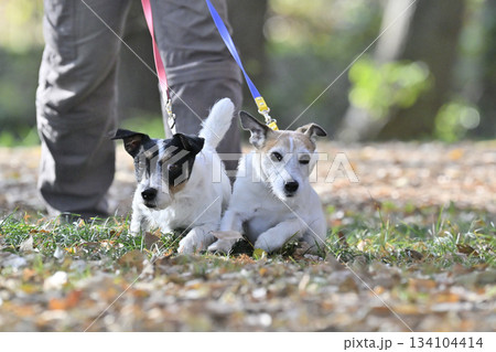 落ち葉の上を散歩する仲良しわんこ 2匹のジャックラッセルテリア