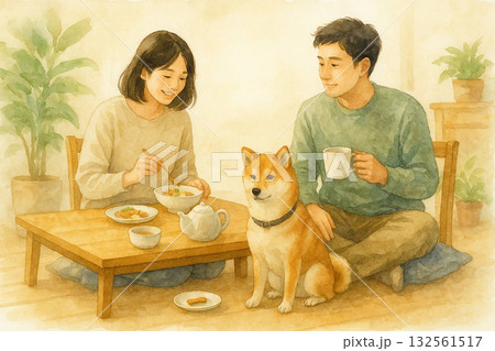 木のテーブルで秋のブランチを楽しむ日本人カップルと赤柴