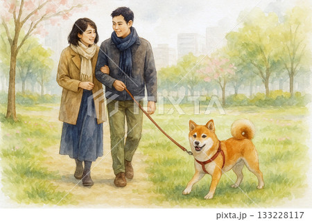 桜咲く公園でほほえむ老夫婦と柴犬の春日和
