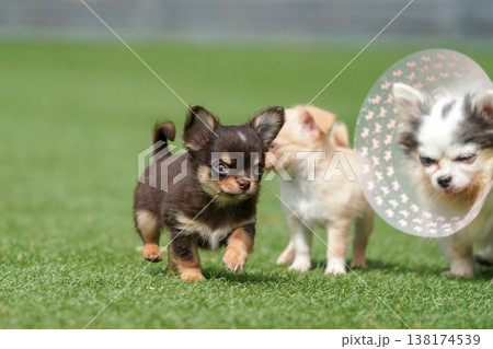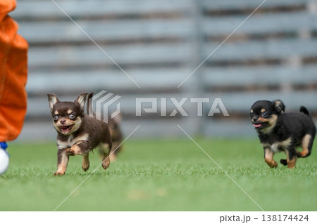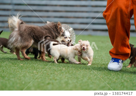 ドッグランで遊ぶチワワの親子と赤ちゃん(パピー)
