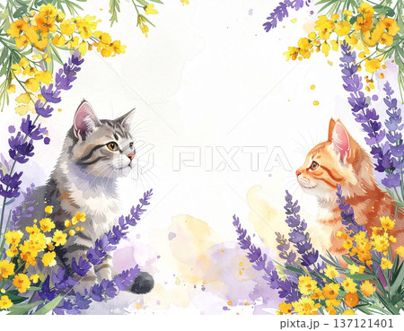 春の花々と仲良しなキジトラと茶トラの猫のイラスト