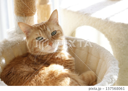 キャットタワーのベッドで丸くなって眠るエキゾチックショートヘアの猫