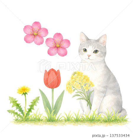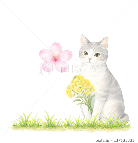 白猫と桜と菜の花の水彩イラスト 春のかわいい猫素材