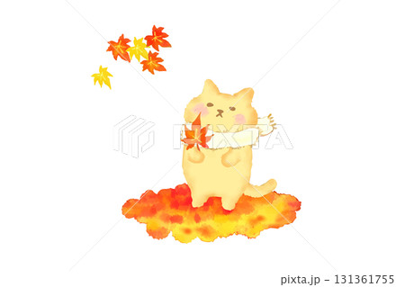 秋・紅葉を持って秋を楽しむかわいい猫 水彩イラスト素材
