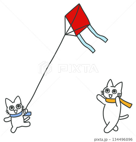凧揚げをして遊ぶかわいい二匹の白猫のイラスト
