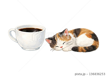 珈琲カップと眠る三毛猫の水彩イラスト素材|やさしいカフェ時間モチーフ