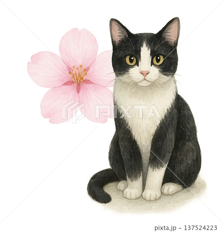 黒白猫と桜の水彩イラスト 春のかわいい猫素材