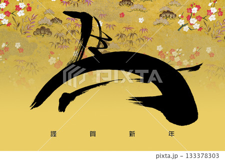 白馬と正月の縁起物の和風かわいいキャラクター年賀状 2026 松竹梅・富士山・鶴亀