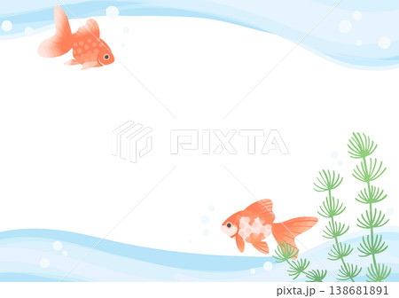 金魚のフレーム(波紋・影・水草・横型・背景あり)上から見た和風の印刷用デザイン素材