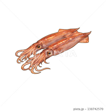 水彩で描いたシンプルなスルメイカのイラスト素材【手描き】白バック 透過背景 コピースペースあり