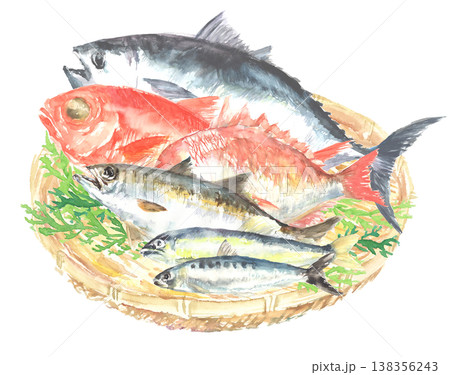 水彩で描いたザルにシンプルなスルメイカのイラスト素材【手描き】白バック 透過背景 コピースペースあり