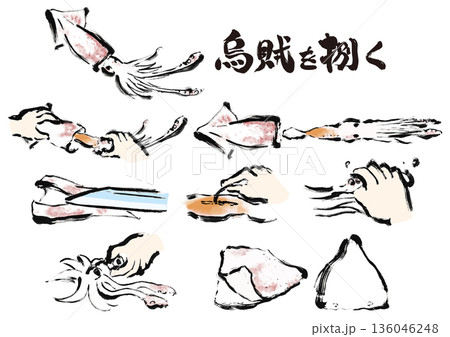 烏賊を捌く和風筆イラスト素材セット