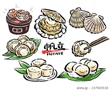 ホタテ 貝や料理など 筆タッチ手描きイラストセット