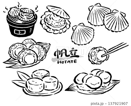 ホタテ 貝や料理など 単色線画のみ イラストセット