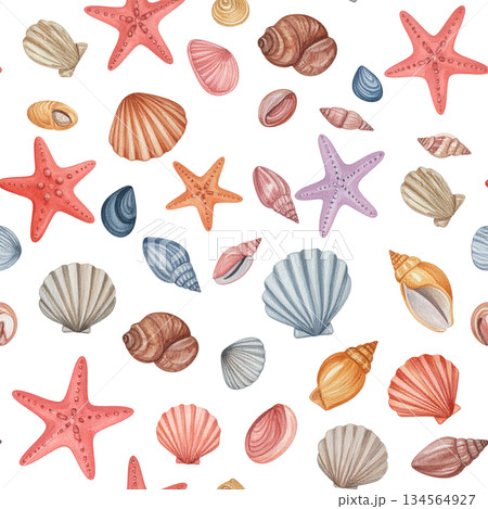 Seamless marine pattern with corals, shells, seaweed, and a starfish. Watercolor illustrations of underwater animals. Hand drawn isolated art. Wild nature for fabric, paper, wallpaper, and textiles.