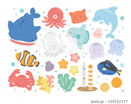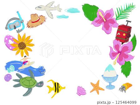夏の海のフレームセット、かわいい魚や海の生き物たちをあしらった飾り枠のイラストセット01