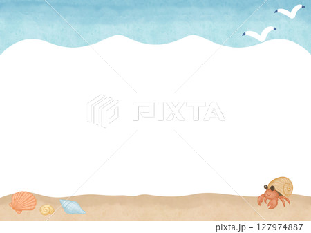 貝殻とヤドカリ 海の背景 水彩フレーム
