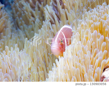 パステルカラーに白化したイソギンチャクとクマノミの赤ちゃん