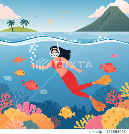 夏の海でダイビングをするベクターイラスト
