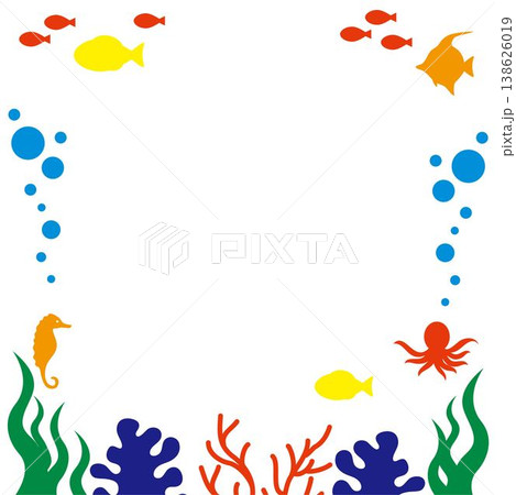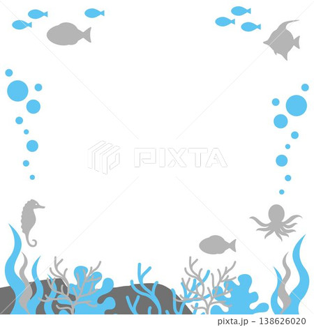 海の中の生き物 シルエット フレーム 背景 魚 タコ タツノオトシゴ サンゴ 飾り イラスト素材