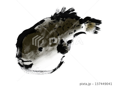 筆と墨の飛沫の和風なフグの墨絵イラスト