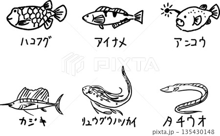 可愛いハコフグ・アイナメ・アンコウ・カジキ・リュウグウノツカイ・太刀魚の魚の線画イラスト素材