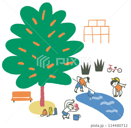 茂った大木のある公園の池でザリガニ釣りをする子供たち イラスト素材