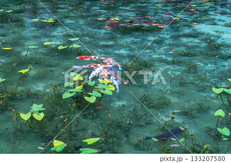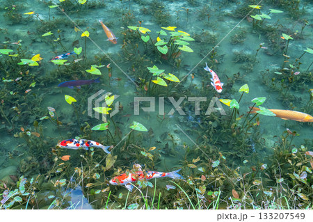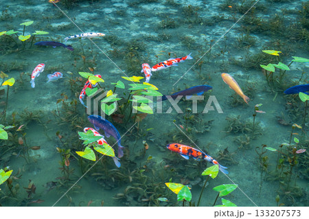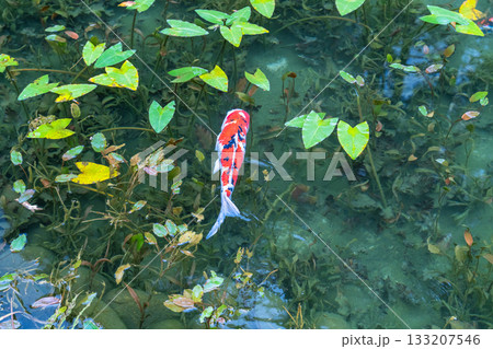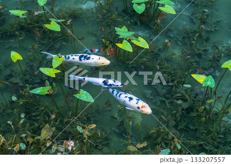 優雅に泳ぐ鯉 池で泳ぐ錦鯉 色鮮やかな錦鯉 観賞魚