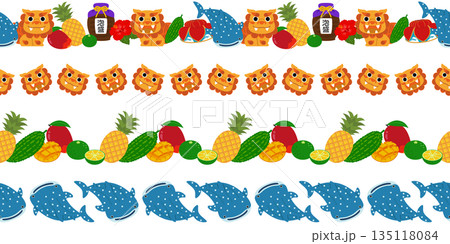 手描き沖縄イメージイラスト、首里城・シーサー・ジンベイザメ・珊瑚・ハイビスカス