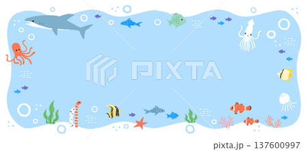 Background with sea inhabitants. Banner template. Frame with corals, jellyfish, octopus and other marine animals on white background.
